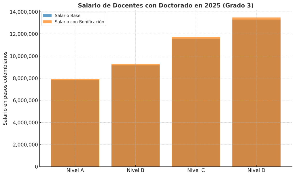 Aquí tienes el resumen gráfico en formato visual, comparando los salarios base y con bonificación de los docentes con doctorado en 2025 (Grado 3).