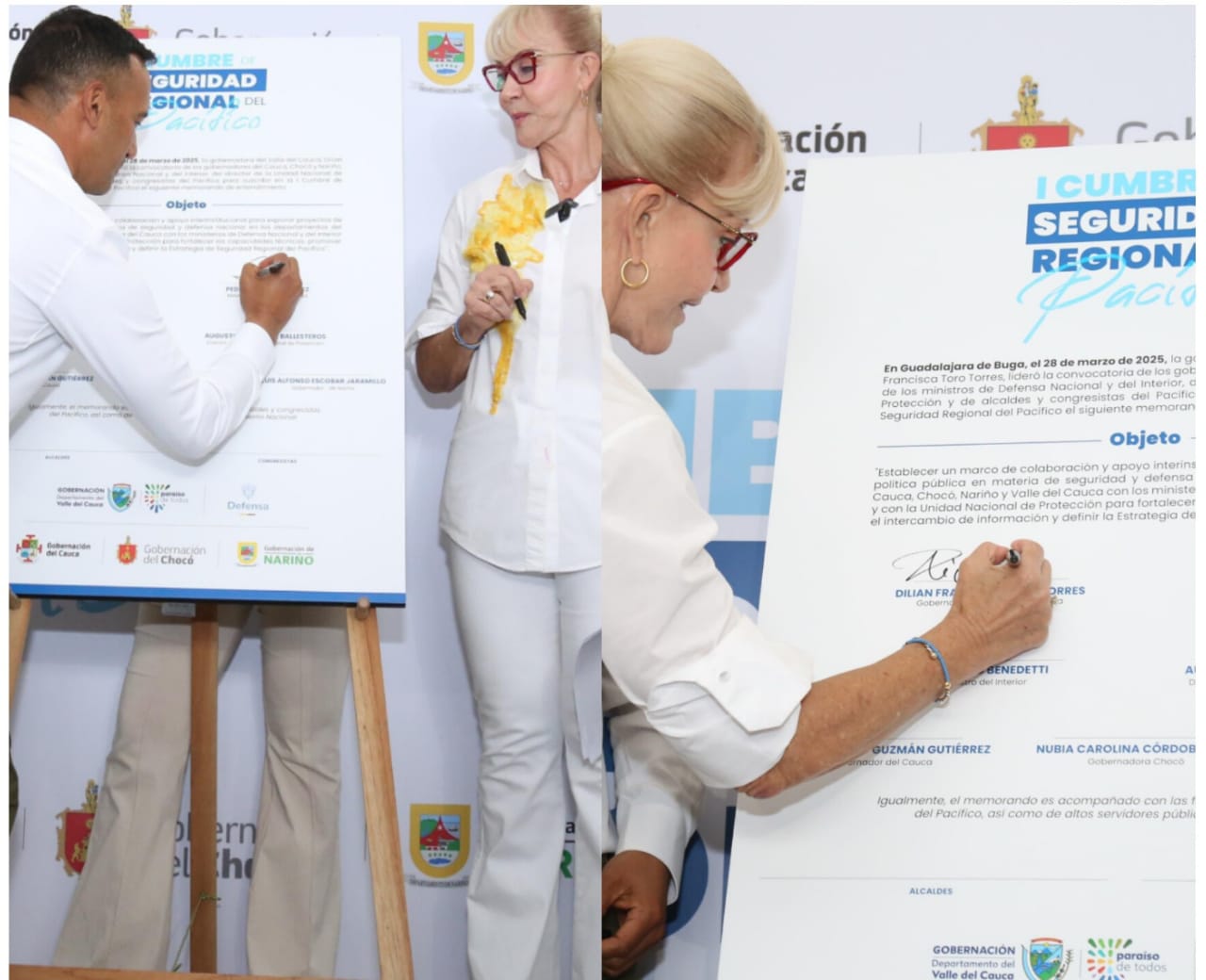 Al culminar la Primera Cumbre de Seguridad Regional del Pacífico realizada el viernes 28 de marzo en Buga, los mandatarios de los cuatro departamentos de la región firmaron un memorando de entendimiento. “A esta la hemos llamado la Primera Cumbre del ‘Pacífico’ Seguro y Unido con Desarrollo Social”, aseguró la gobernadora Dilian Francisca Toro, quién convocó el encuentro.