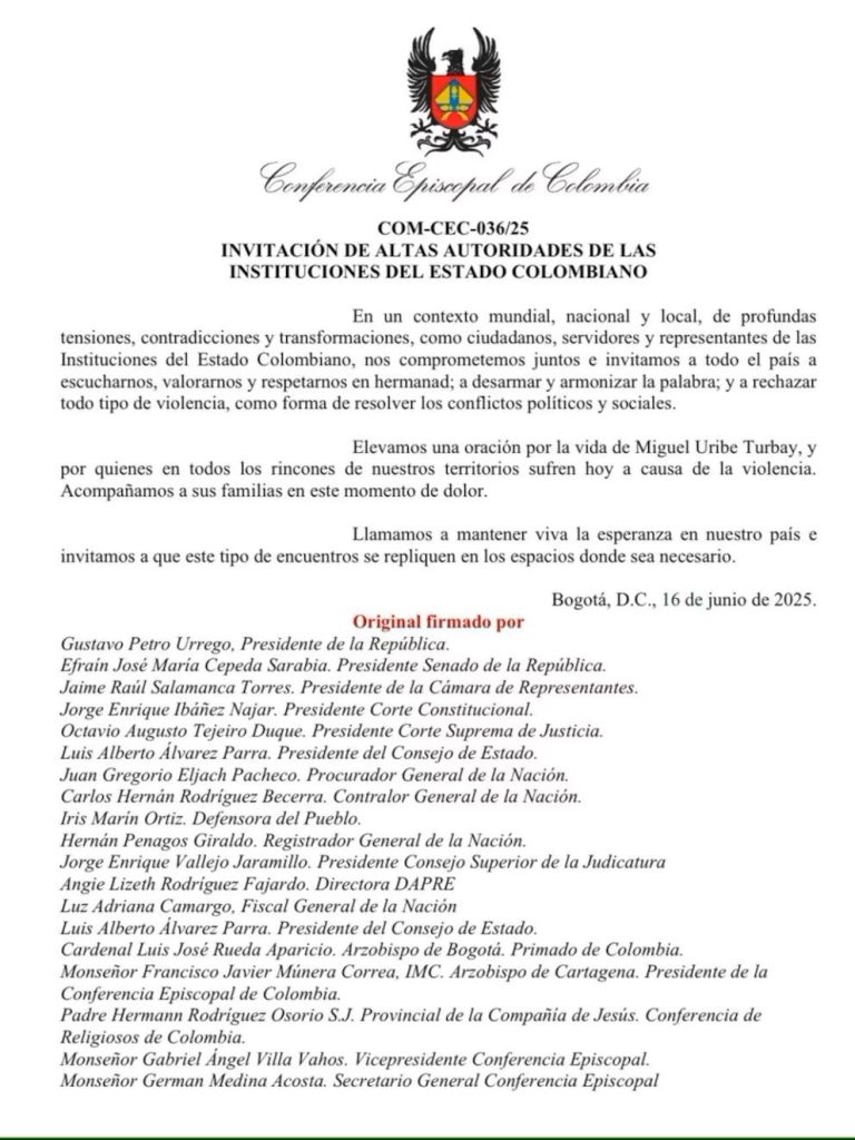 El texto fue firmado por el presidente y vicepresidente de la Conferencia Episcopal, los arzobispos Francisco Javier Múnera y Gabriel Ángel Villa; el presidente Gustavo Petro; el senador Efraín Cepeda; el representante Jaime Raúl Salamanca; y los presidentes de la Corte Constitucional, Corte Suprema de Justicia y Consejo de Estado.